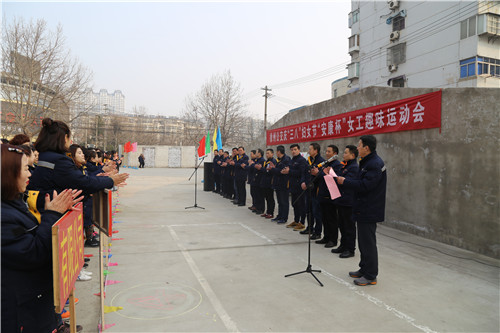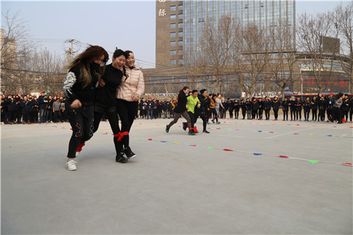 “參賽隊(duì)員各就各位!裁判員準(zhǔn)備計(jì)時(shí)!”運(yùn)動(dòng)會(huì)主持人一聲令下,首先開(kāi)始比拼的項(xiàng)目是需要隊(duì)員齊心協(xié)力,發(fā)揚(yáng)合作精神的“三人四足接力賽”,三人一組紅繩綁腿齊步走,每隊(duì)12名參賽隊(duì)員,比的是速度,更是勁兒往一處使的同心合力?!凹佑?!加油?。 薄耙欢?!一二!”比賽場(chǎng)上運(yùn)動(dòng)員的號(hào)子聲和場(chǎng)外女工們的加油聲、歡笑聲交織一起,此起彼伏。