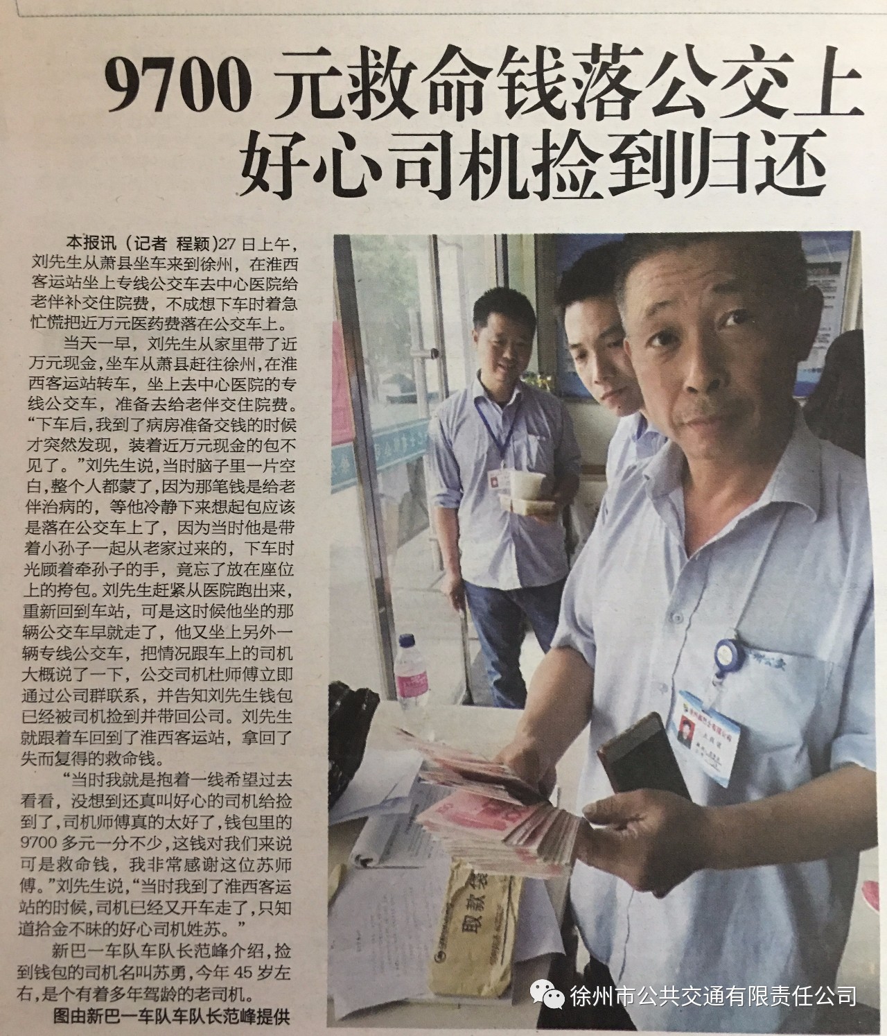 車隊(duì)管理人員打開包尋找乘客的聯(lián)系方式,發(fā)現(xiàn)包里有一個(gè)信封,信封里面裝著9700元現(xiàn)金,便立即將包妥善保管。不久,失主劉先生來(lái)到調(diào)度室尋找,看到失而復(fù)得的包裹十分激動(dòng),他說:“我抱著一線希望來(lái)這兒看看,沒想到還真叫好心的司機(jī)給撿到了,9700元一分不少。這錢對(duì)我們來(lái)說是救命錢,今早到醫(yī)院給老伴補(bǔ)交住院費(fèi)的,我非常感謝蘇師傅”。